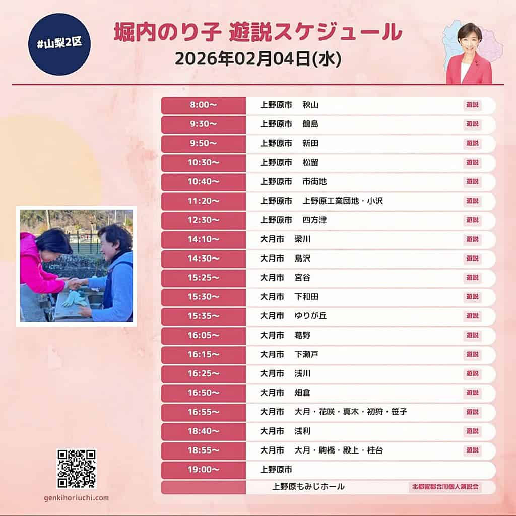 明日(2/4)は、上野原市・大月市を遊説で回ります。